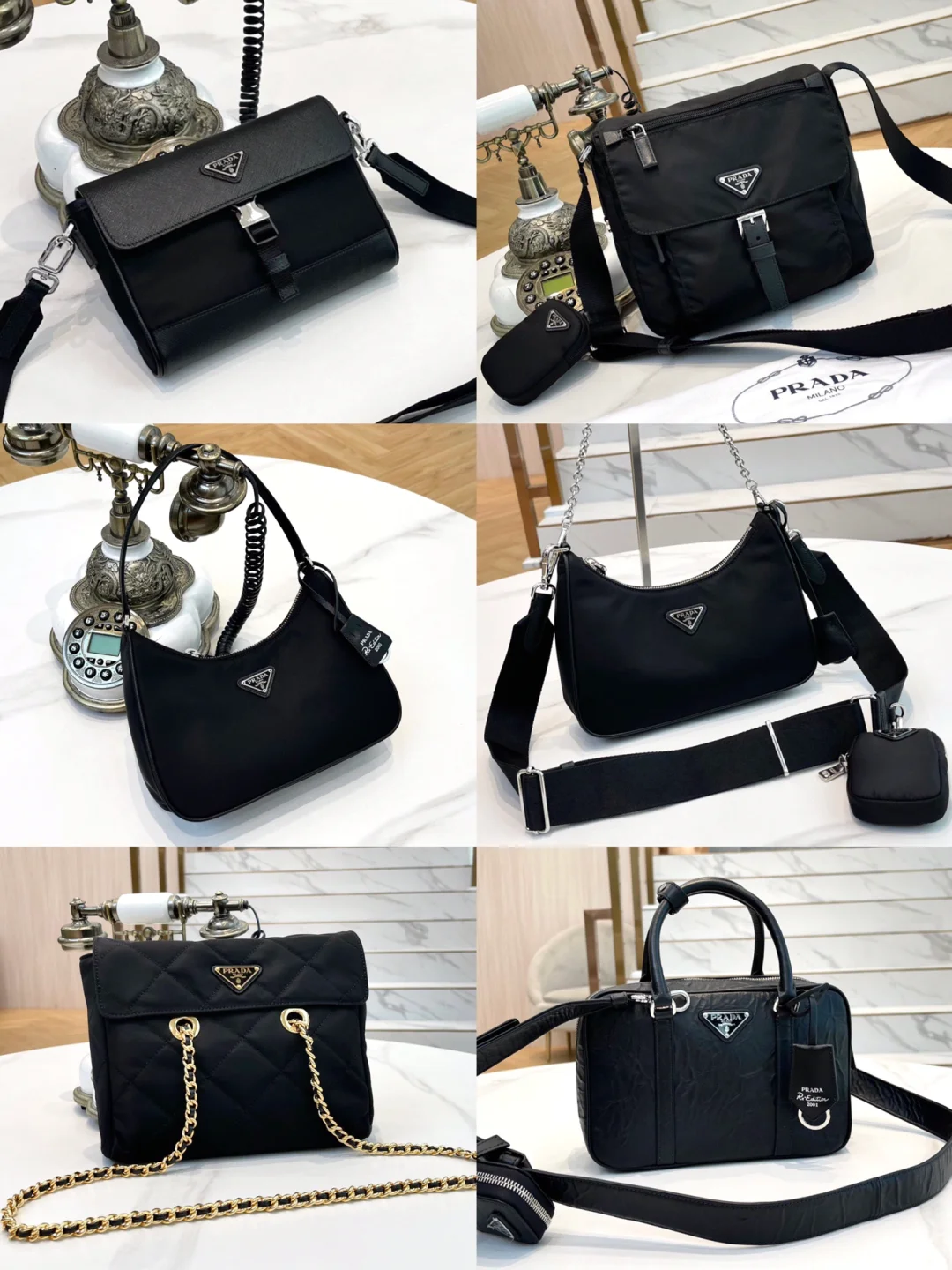 Signature Prada metal logos accent these bags, merging timeless elegance with modern functionality